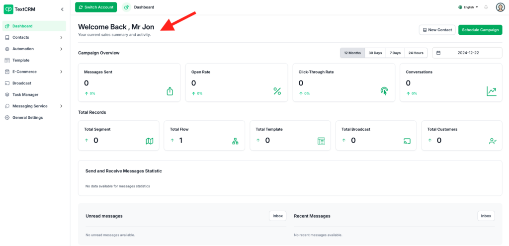The admin panel in TextCRM allows you to log in as a staff member for troubleshooting or management purposes. This feature enables admins to access staff accounts temporarily and revert back to their own account seamlessly.